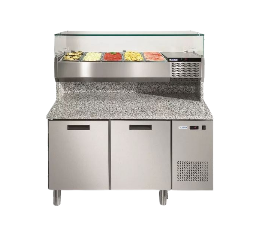 Le meuble de préparation pizza MPF2 est conçu pour les professionnels recherchant un poste de travail réfrigéré, compact et efficace. Avec ses 2 portes réfrigérées, son dessus en granit et sa console réfrigérée à ingrédients, il offre une solution fonctionnelle pour la préparation en pizzeria, snacking ou restauration rapide.